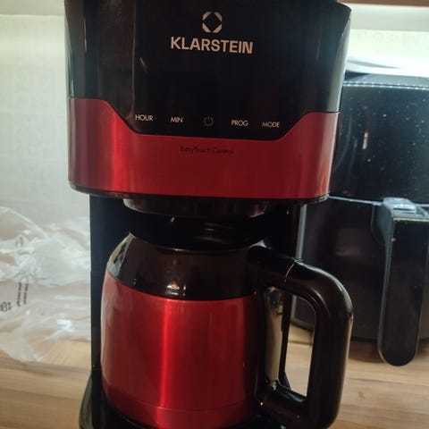 Hyväkuntoinen kahvinkeitin termoskannulla, keittimessä myös arominsäätökytkin joten voit valita vahvan ja miedon kahvin välillä. Automaattinen virrankatkaisu, Keittimellä vielä takuuta 18.7.2026 asti