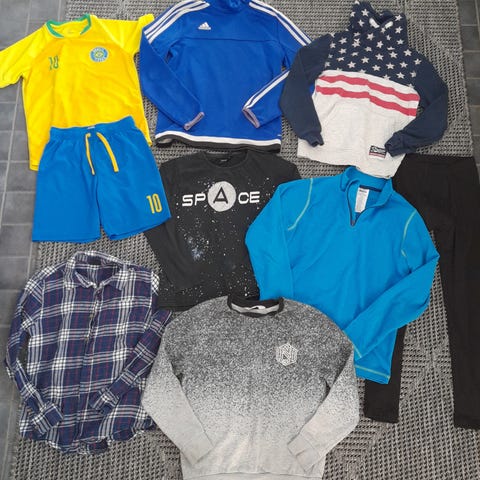 Kuoritakki, kuorihousut, pörrötakki, kaksi pitkähihaista, uimahousut ja collegepaita. Merkkeinä mm. Hilfiger, levis, warp ja everest.