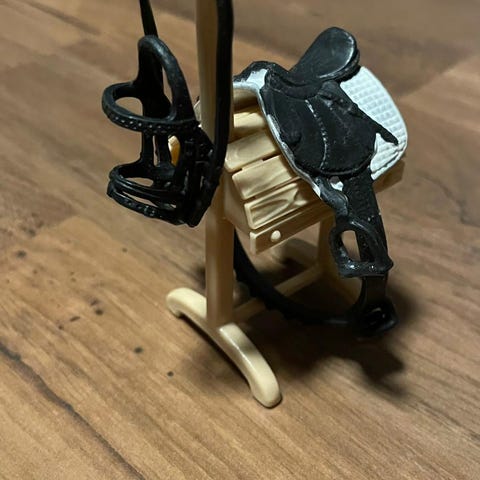 Schleich varustesetti, satula, suitset, kypärä, varusteiden säilytys teline