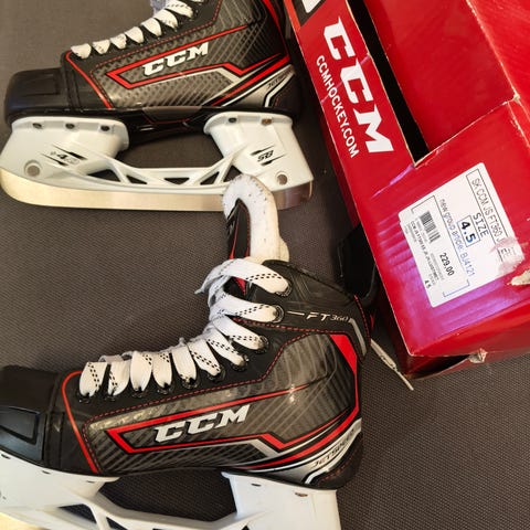 Myydään CCM luistimet, itselle liian pienet jalkaan. EE lestillä, eli leveällä lestillä! Ei ole uudet, eli pientä kulumaa ja satunnaisia kiekon jälkiä luistimista löytyy, kuitenkin edelleen todella ryhdikkäässä kunnosssa olevat luistimet. Vasemman luistimen ulkosyrjän kankaassa pieni repeämä (näkyy kuvissa).