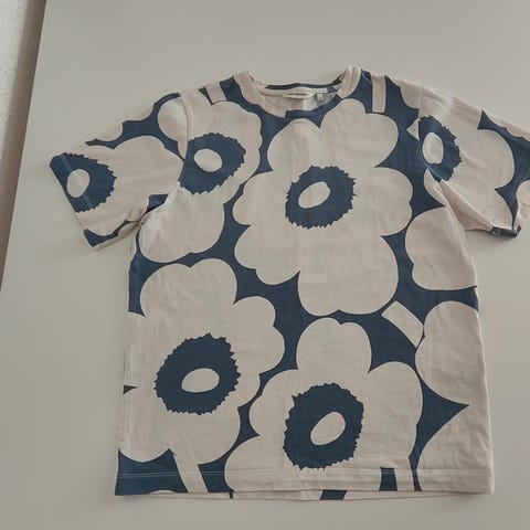 Myydään Marimekon unikkokuvioinen t-paita. Laput leikattu irti. Koko S, mutta väljä malli. Kuvio hitusen haalistunut pesussa, yleisilmeeltään kuitenkin todella siistissä kunnossa. Savuton ja eläimetön koti. Postitus onnistuu.