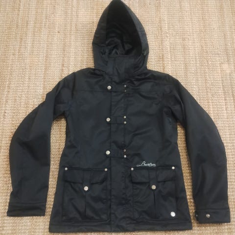 Burton-merkkinen naisten laskettelutakki/välikausitakki/tuulitakki. Hieno kirjava punertavasävyinen kuosi. Koko S. Sisäpuolella lantion kohdalla kiristyssysteemit ettei tuuli pääse, kiristettävä huppu, helma ja hihansuut.