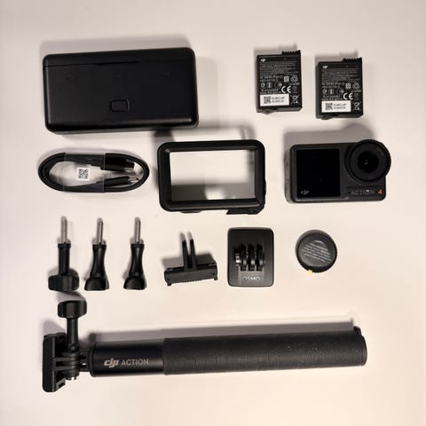 DJI Osmo Action 4 action camera including the camera and accessories. The camera is suitable for versatile filming in different conditions.