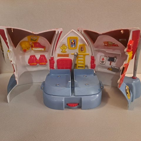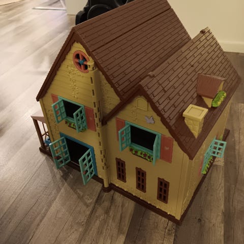 Leikkitalo, jossa sinivalkoinen väritys ja oransseja yksityiskohtia. Leikkitalo sisältää useita tiloja ja kalusteita, kuten työpöydän ja tuolin. Soveltuu lasten leikkeihin.