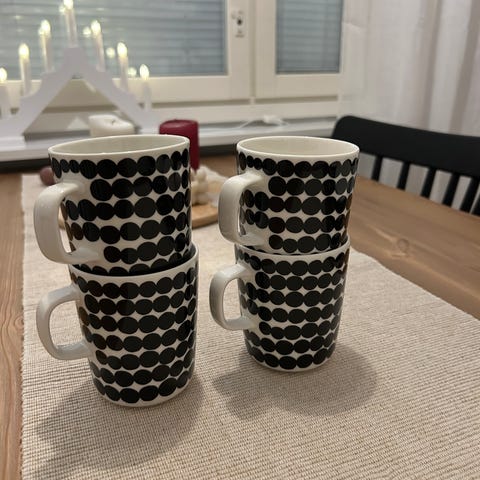 Marimekko mukit, joissa on vihreä, musta ja valkoinen pallokuvio. Todella vähäisessä käytössä ollut. Yksittäin 15€/kpl. Molemmat ostaessa 25€ yhteensä. Postitus mahdollinen lisähintaan, en käytä toridiiliä.