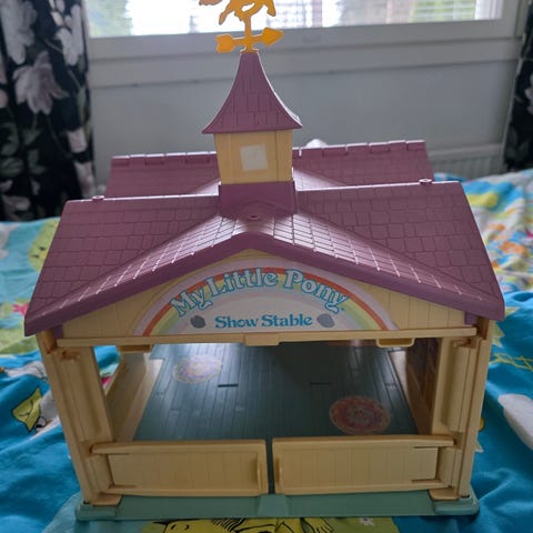 Myydään erittäin hyväkuntoinen My Little Pony talli tarvikkeineen vuodelta 1983. Kaikki ovet, liput ja kellotorni tallella. Myös suurin osa tarvikkeista ja huonekaluista on mukana. Tarroissa kukumaa. Yhtä ovea korjattu teipillä.