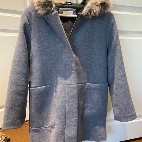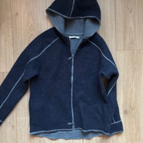 Villasekoitteesta valmistettu vyötäröltä tyköistuva takki kokoa 164 cm. Pituus n. 87 cm Kuvassa 158 cm pitkän aikuisen yllä. Sievä kaareva leikkaus. Näkyvien taskujen lisäksi povitasku.