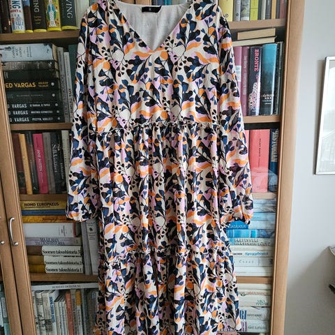 Hienokuntoinen House maksimekko vuoritettua polyesteriä. Koko 42, mitat kai-kai kietaisutyyppisen leikkauksen takia rakas mitattuna 55cm, vyötärön kuminauha joustaa leveydesdä 52cm asti, helman leveys 103cm, olka-helma 145cm. 13e mm.