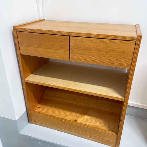 Annetaan Jyskin valkoinen lipasto. Ehjä ja siisti. Hieman kellastumaa vetolaatikoiden ja tason pystyreunoissa. Kannessa pieni kolhu, joka näkyvillä toisessa kuvassa.