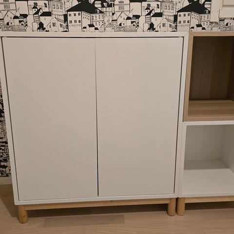 Moitteettomassa kunnossa oleva valkoinen Ikean Eket kaappi, puunvärisillä jaloilla.