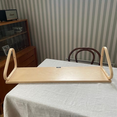 Artek 112B seinähylly. Siistikuntoinen, tason reunassa teipistä jäänyt haalea jälki (kuva). Lähtee ehkä rapsuttamalla pois,poistoa ei ole kokeiltu. Hyllyn voi asettaa molemmin päin.