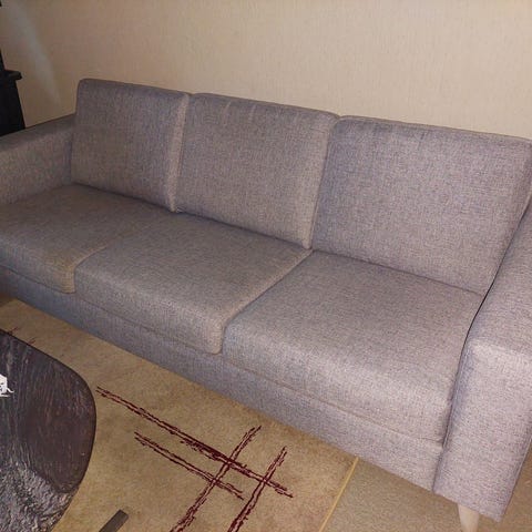 Harmaa 3-istuttava sohva, jossa suorat käsinojat ja vaaleat jalat. Sopii olohuoneeseen tai muuhun oleskelutilaan.