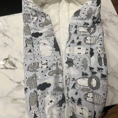 Vaunupussi/Makuupussi. Kangas 100% puuvillaa. Pitkä ja käytännöllinen vetoketju.
