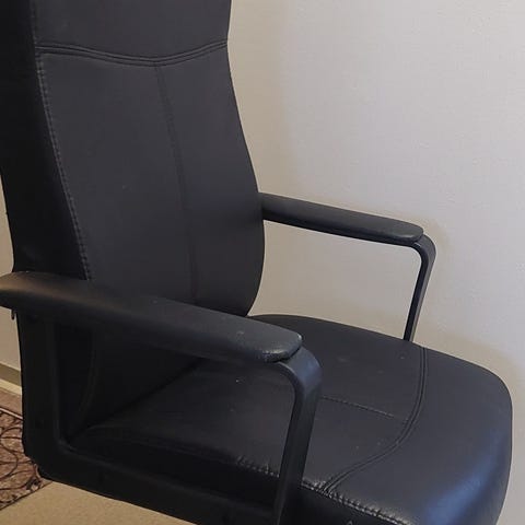 Musta toimistotuoli, jossa on pyörät ja säädettävät käsinojat. Tuolissa on korkea selkänoja ja pehmustettu niskatuki.
