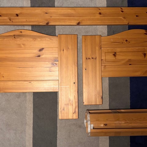 Annetaan käytetty, puunvärinen sängyn runko 90cm x 200cm ilman sälepohjaa. Päädyt ja laidat on ruuveineen. Haku Pukinmäestä