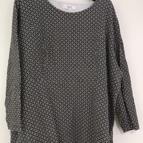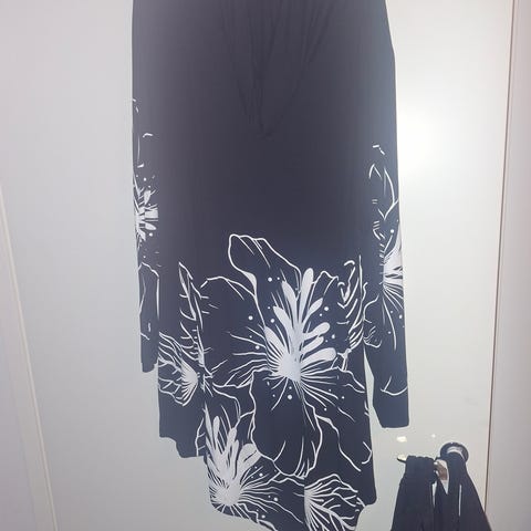 Hyväkuntoinen Bonprix pusero mustavalkoista viskoosia graafisella kukkaprintillä. Koko pienehkö 50, mitat kai-kai 64cm, helman leveys 69cm, olka-helma 72cm. Pitkät, kuminauhasuiset pussihihat. Takanappi etulaskokse antavat väljyyttä. 8e mmm