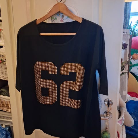 T-paita. Koko L-XL. Valkoinen. Kiiltäviä kiviä edessä ja vihreää.