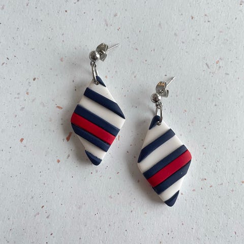Raidalliset veneilyhenkiset korvakorut. Tummansinistä ja punaista raitaa valkoisella pohjalla. Raidat koholla. Korkeus noin 5,9cm. Käyttämättömät. Valmistettu polymeerimassasta.