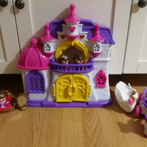 Moneksi avautuva linna, 8 ihmishahmoa ja hevosten vetämä kurpitsavaunu.