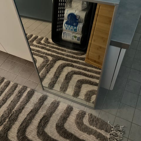 Peili mustilla kehyksillä ja tekonahkaremmillä josta sen saa roikkumaan. Halkaisija 41cm.