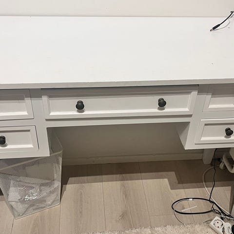 Valkoinen VidaXL työpöytä puusta. Hyvä kunto muuten, mutta pinnassa on jonkin verran jälkiä. Kunnostamalla saisi erinomaiseen kuntoon. OVH: 246€, hinnasta saa neuvotella ja tarjota. Nouto Raisiosta.