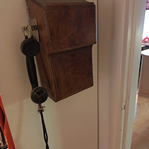 Kuvan wanha seinäpuhelin leijona logolla.Upea koriste.