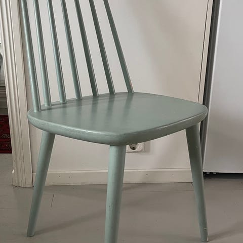 Tuoli täysin ehjä, tukeva,mutta maalipinta istuinosassa jo kulunut. Vihreä alkuperäiseltä väriltään.