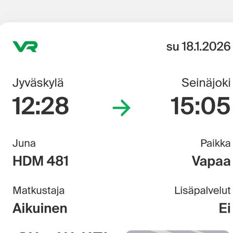 Aikuisen junalippu, Seinäjoki-Pasila, pe 23.1. klo 16.28-19.32.