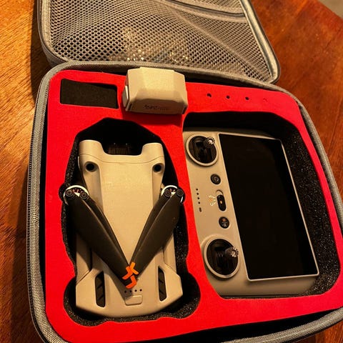 Drone valkoinen väri, mukana useita lisäakkuja ja kestävä kuljetuslaukku. Sopii ilmakuvaukseen ja videokuvaukseen. Drone on varustettu taittuvilla siivillä ja kauko-ohjaimella.