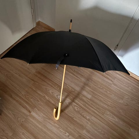 Käyttämätön heijastava Huomio merkkinen sateenvarjo. Kulkemisen helpottamiseksi yksi lohko on läpinäkyvää muovia, muuten varjo on heijastavaa kangasta. Kahva on puuta. Pituus vähän alle 60 cm (23,5 tuumaa). Nouto Turun Pääskyvuoresta.