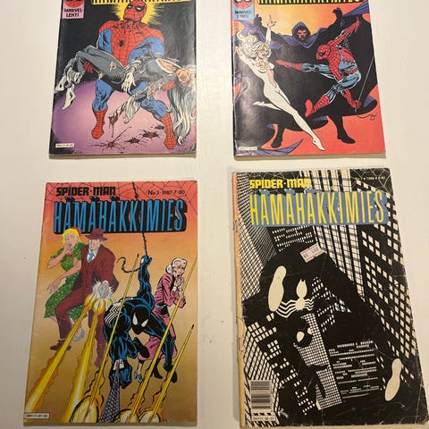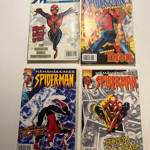 Marvel Spider-Man sarjakuvat, kokoelma useita numeroita. Sarjakuvien kannet ja sivut näkyvissä kuvassa. Sopii sarjakuvien keräilyyn tai lukemiseen.