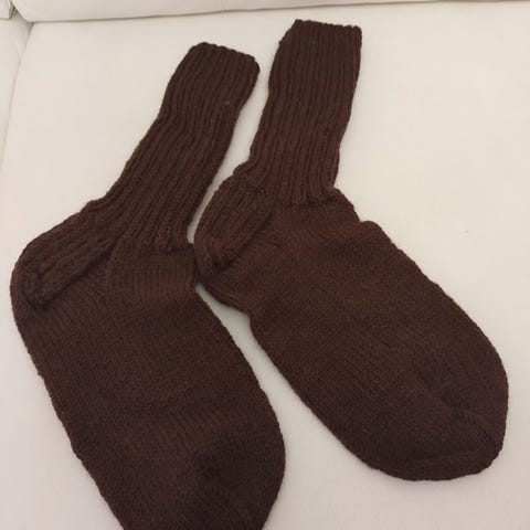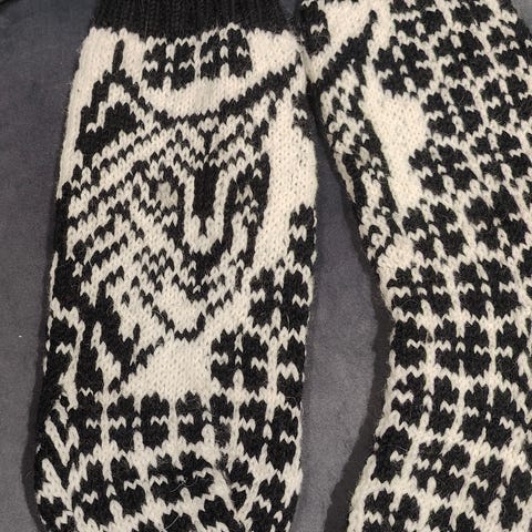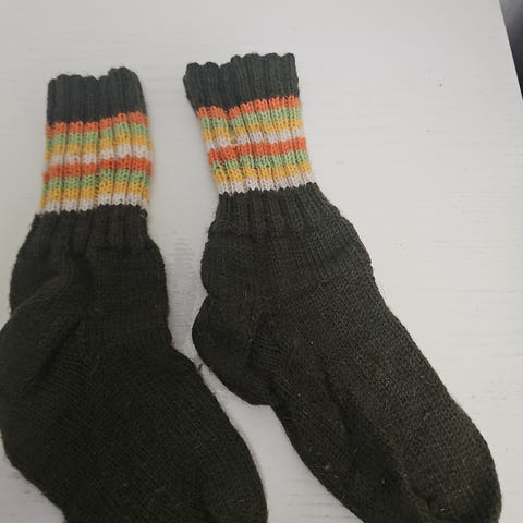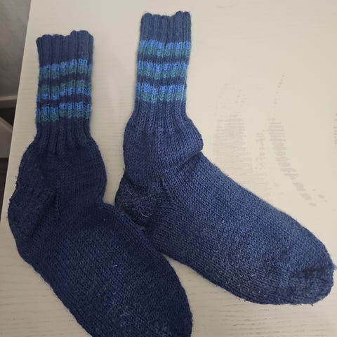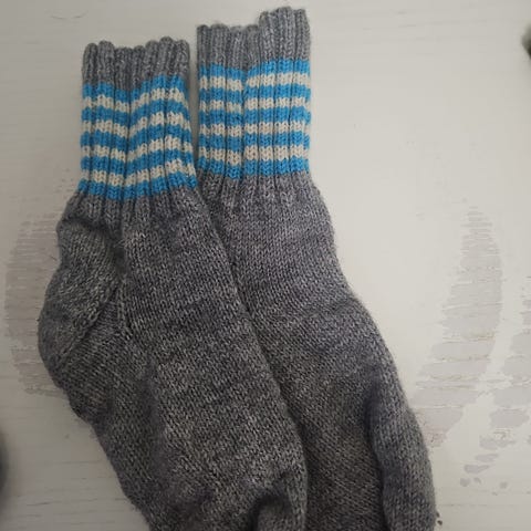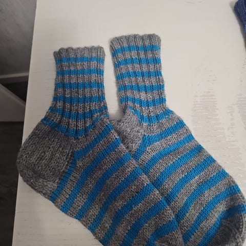 Käsin kudotut, uudet villasukat. Terän mitta yhtään venyttämättä n. 26 cm, varren pituus n. 29 cm. 42/43 jalkaan sopiva. Väri sini-valkoinen.