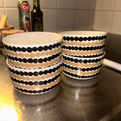 Marimekko Siirtolapuutarha kulhosarja, yht. 5kpl. Kulhot ovat siistissä kunnossa, lukuunottamatta yhtä, jonka reunassa lähes huomaamaton lohkeama. Nouto kangasala tai postitus