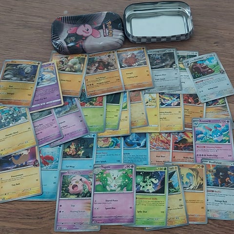 Lapsi haluaa myydä seitsemän Pokemon-korttia yhteishintaan 2e.