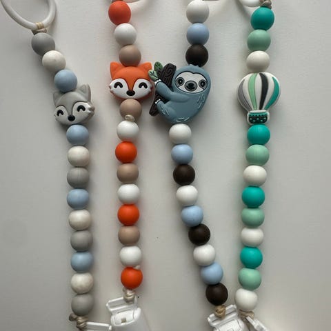 Kolmet tekstiiliset, yhdet elintarvikelaatuiset silikonihelmet ja yhdet puiset, joissa yksi silikonihelmi. Hinta yhteensä.