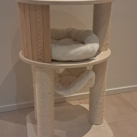 Kissan kiipeilypuu, jossa useita tasoja, pesäke ja raapimatolpat.
