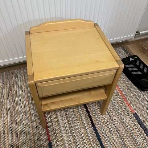 Valkoinen yöpöytä, joissa on kaksi laatikkoa. Pöydässä on hyvin pieniä käytön jälkiä ja kuvassa näkyvä pieni kulmavaurio. Vetolaatikot toimivat normaalisti. Nouto Jäälistä. Maksuna mieluiten Mobilepay, mutta käteinen sopii myös.