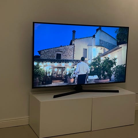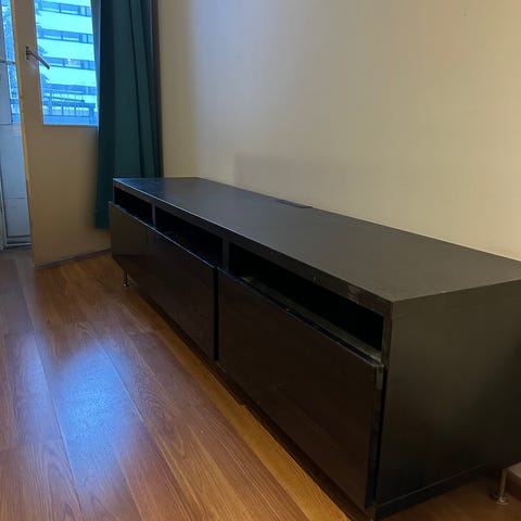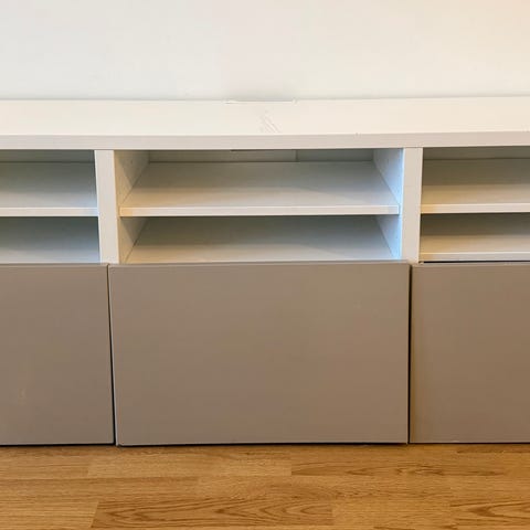 IKEA tv-taso valkoinen lasipinnalla, jossa kaksi ovea ja sisähylly. Sopii tv tasoksi ja säilytykseen. Hyvässä kunnossa.