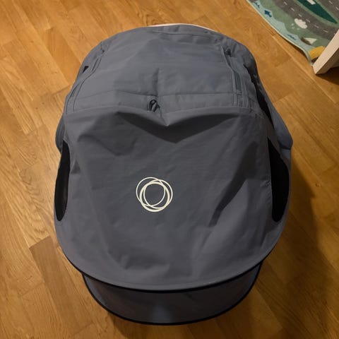 Paljon käytetty ja hieman haalistunut/kellastunut kesäkuomun kangas. Kuomun sisällä kuminauhat jo venyneet muttei vaikuta käyttöön.