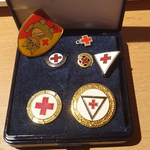 SPR rintaneula, jossa on punainen sydänkuvio ja hopeanvärinen reunus. Pieni koko, sopii asusteeksi tai keräilyesineeksi.