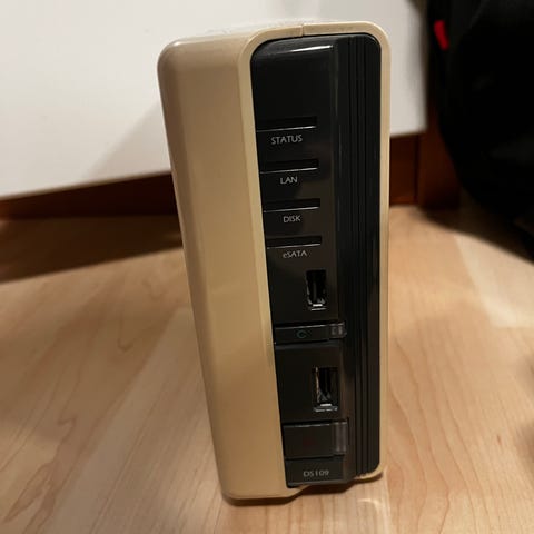 Tästä vaikka ensimmäiseksi NASsiksi kokeiluun täysin valmis kokoonpano. Lisätty 4GB ei Synologyn muistia. Levyillä käyttötunnit jonkin matkaa yli 40 tuhatta tuntia, mutta ovat ihan kunnossa eikä virheitä levyntarkistuksissa ole noussut.