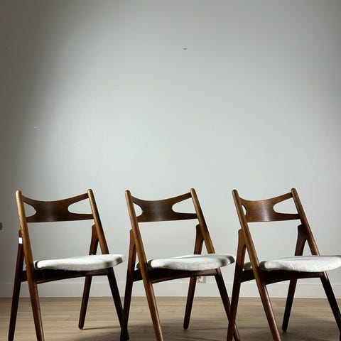 Kai Kristiansenin suunnittelemat ja Schou-Andersen Møbelfabrikin tuottamat tanskalaiset tunnetut model 31 teak ruokatuolit.