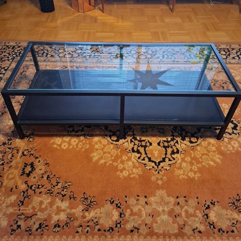 -Kyseessä on Ikean Byås TV-taso, joka on korkeakiiltoinen ja väriltään on valkoinen.