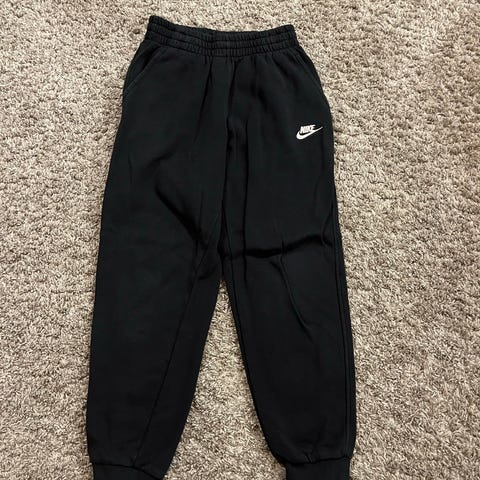 Nike mustat puuvillaiset housut pojille, koko 158. Housuissa on joustava vyötärö ja resorit lahkeissa, sopivat vapaa-ajan käyttöön.