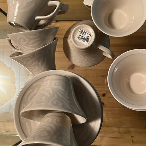 Tarvittaessa löytyy toinen samanlainen setti eli yhteensä 18 kahvi- ja 2 teekuppia