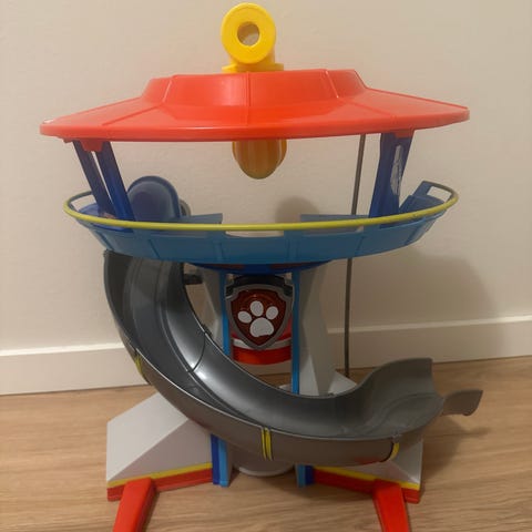 Ryhmä Hau vahtitorni ja kaksi pientä metallista autoa. (Samppa ja Vainu) Molemmille autoille omat liukumäet ja autot voi lähettää samaan aikaan ylhäältä.