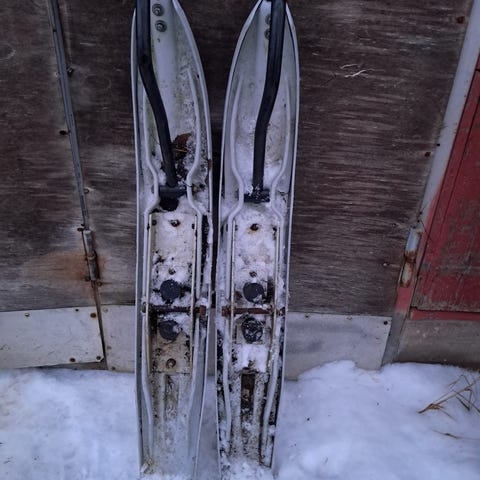 Moottorikelkan sukset joutilaana, hyvillä ohjainraudoilla. Hinta toimitettuna.