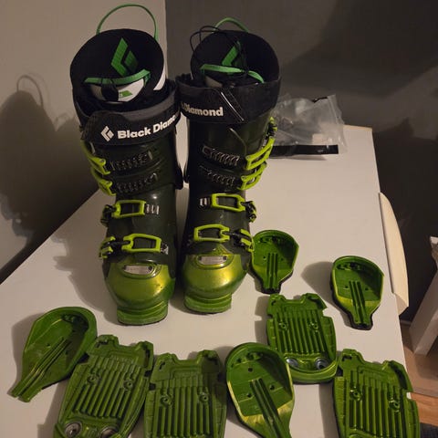 Laadukkaat Black Diamond Quadrant vapaalaskumonot, sopii pinni ja normaaliin siteeseen. Pohjat ja lukot kunnossa, ehjät sisäkengät BOA kiristyksellä(toimii) mondopoint 26.0 sopii 39-40 kokoista kenkää käyttävälle.