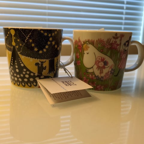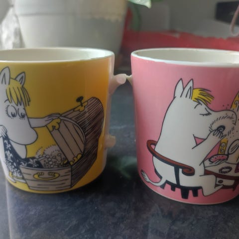 Muumimukit, 20kpl, kaikki rikki. Soveltuu esimerkiksi korujen tekoon tai mosaiikki työhön. Mukit ovat posliinia.