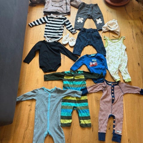 Eri merkkisiä lasten vaatteita, koko 68, väriltään kirjava. Mukana erilaisia housuja ja bodyja, jotka soveltuvat unisex-lapsille.